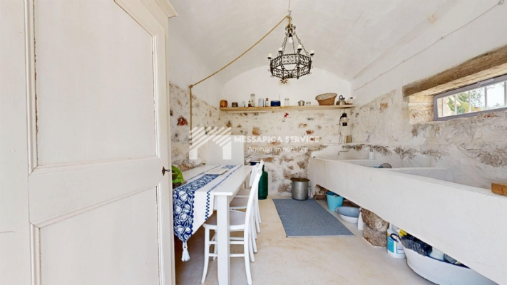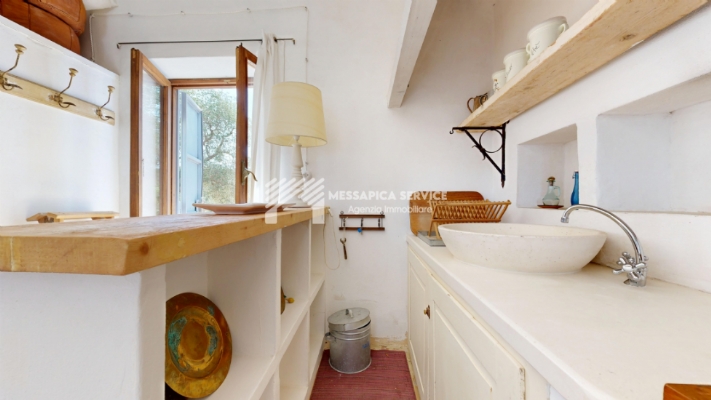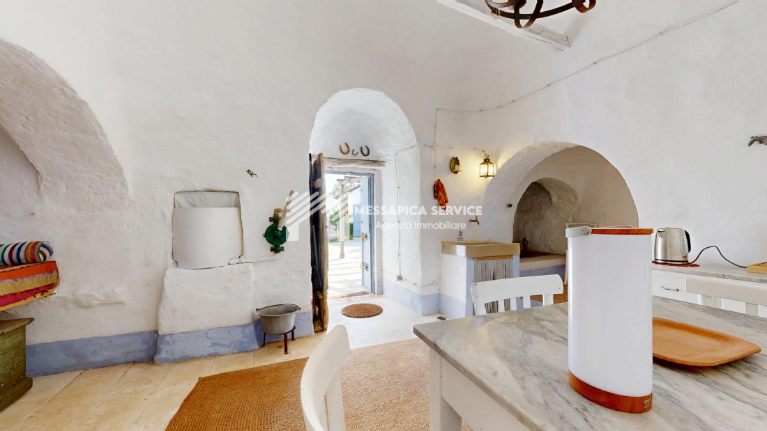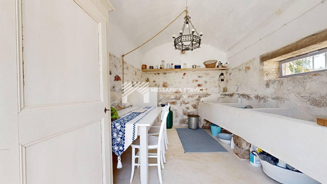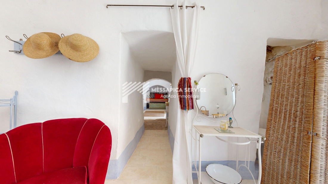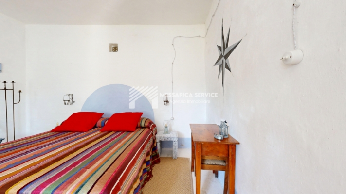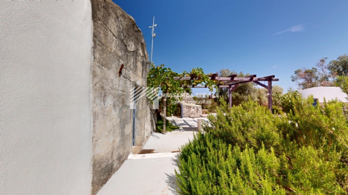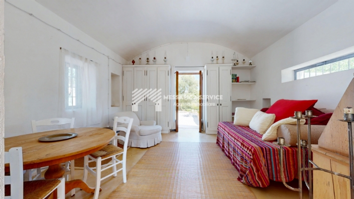 L'abitazione principale include una sala d'ingresso con un'incantevole alcova letto, due camere da letto e un bagno completo realizzato in un cono e con accesso dall’esterno. Di fronte, si trovano altre tre lamie che arricchiscono la proprietà così strutturate: