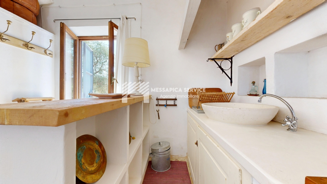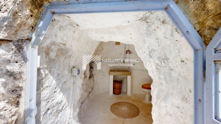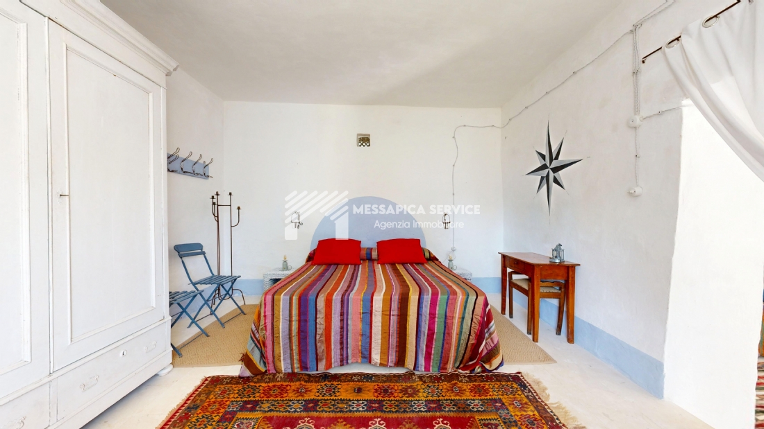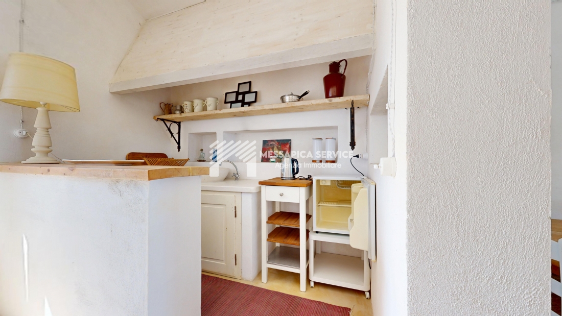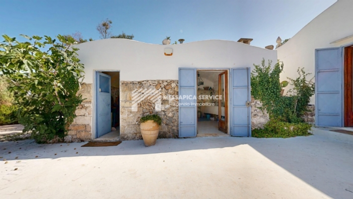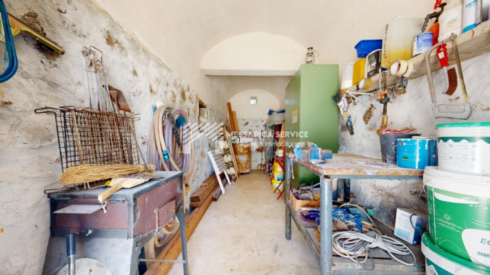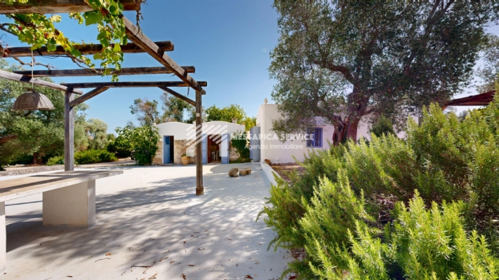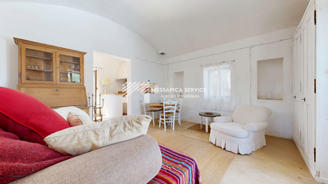 L'abitazione principale include una sala d'ingresso con un'incantevole alcova letto, due camere da letto e un bagno completo realizzato in un cono e con accesso dall’esterno. Di fronte, si trovano altre tre lamie che arricchiscono la proprietà così strutturate: