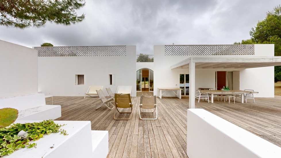 La villa principale, un'autentica oasi di lusso di circa 230 metri quadrati, accoglie gli ospiti in un luminoso atrio che conduce ad un ampio soggiorno/sala da pranzo, cuore pulsante della casa. Qui, un camino in pietra locale, acceso nelle serate più fredde, crea un'atmosfera intima e accogliente. La...