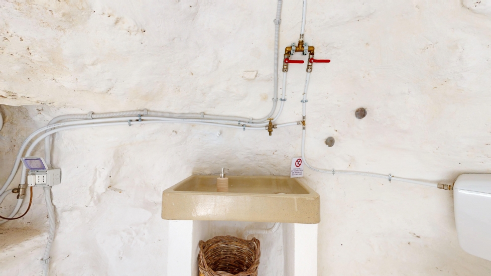 L'abitazione principale include una sala d'ingresso con un'incantevole alcova letto, due camere da letto e un bagno completo realizzato in un cono e con accesso dall’esterno. Di fronte, si trovano altre tre lamie che arricchiscono la proprietà così strutturate: