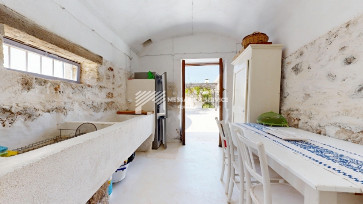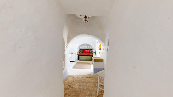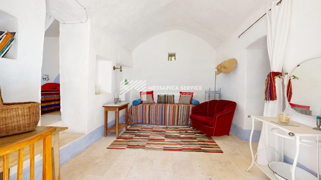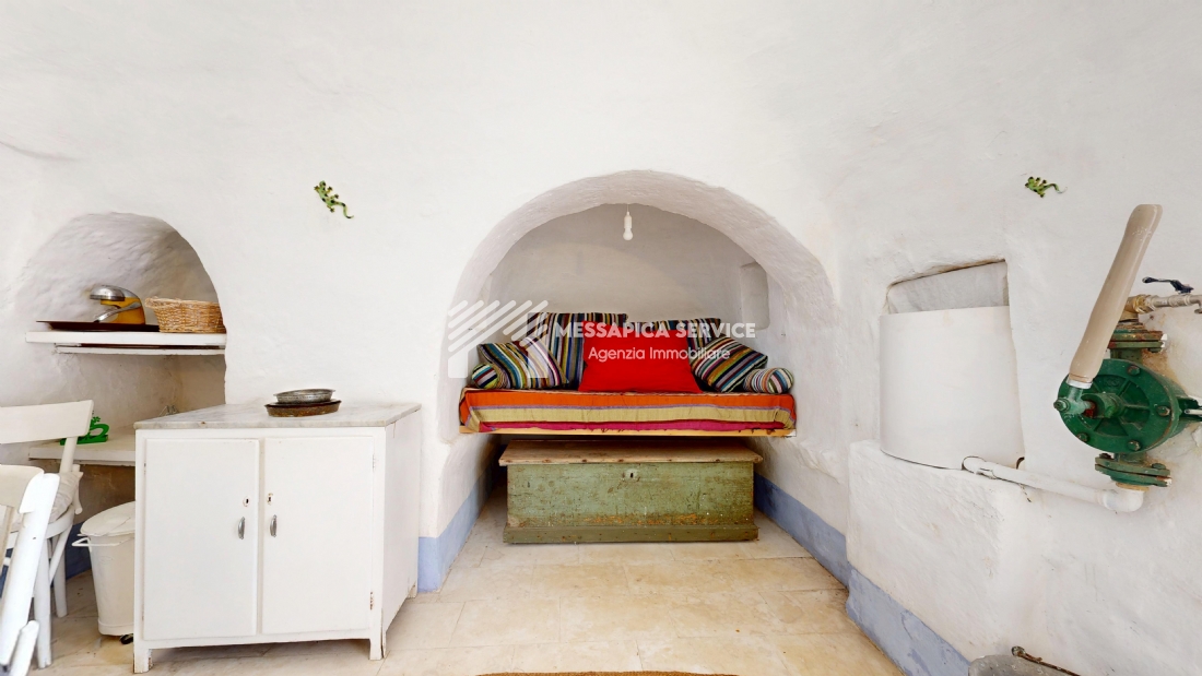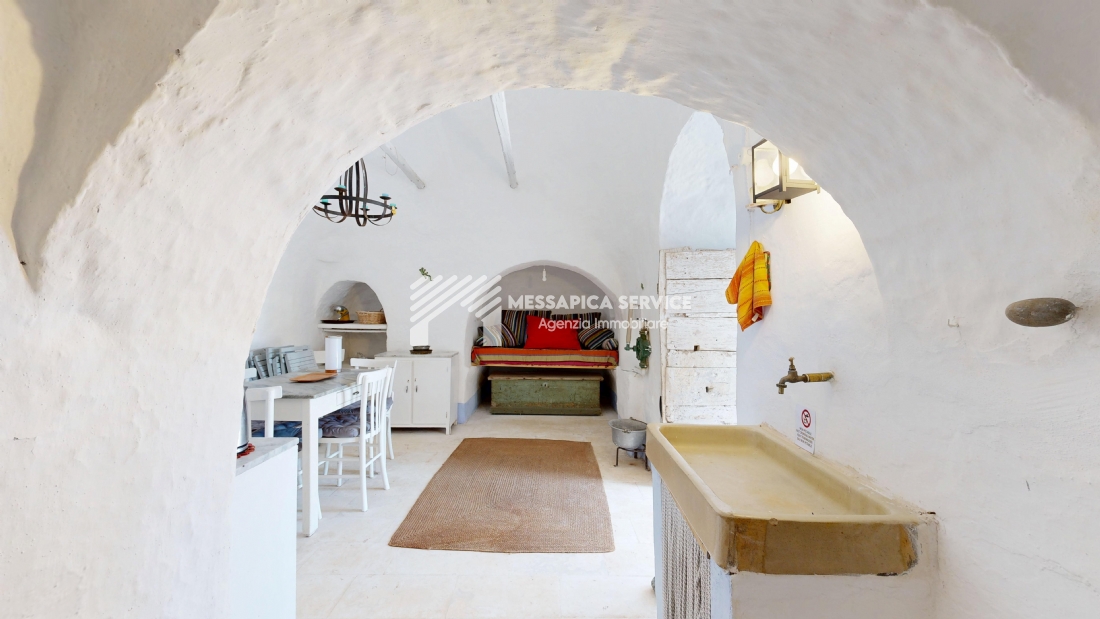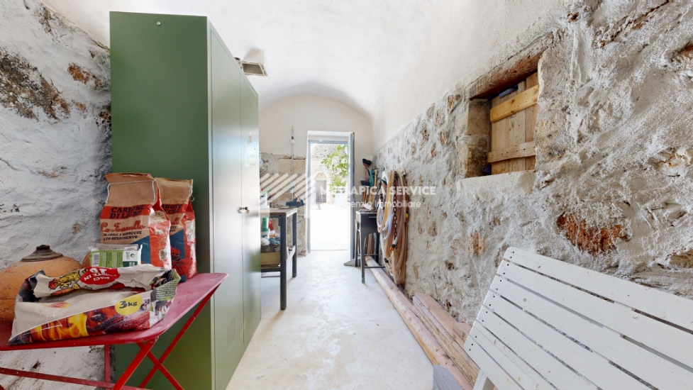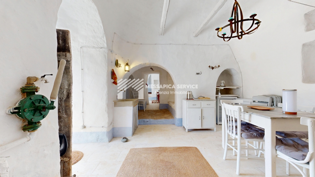 L'abitazione principale include una sala d'ingresso con un'incantevole alcova letto, due camere da letto e un bagno completo realizzato in un cono e con accesso dall’esterno. Di fronte, si trovano altre tre lamie che arricchiscono la proprietà così strutturate:
