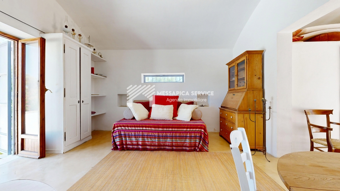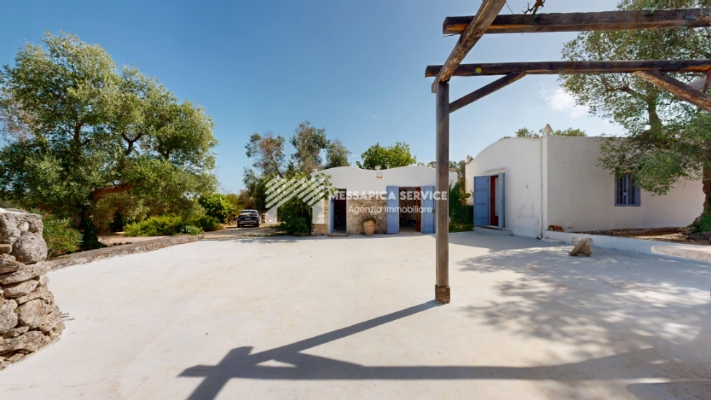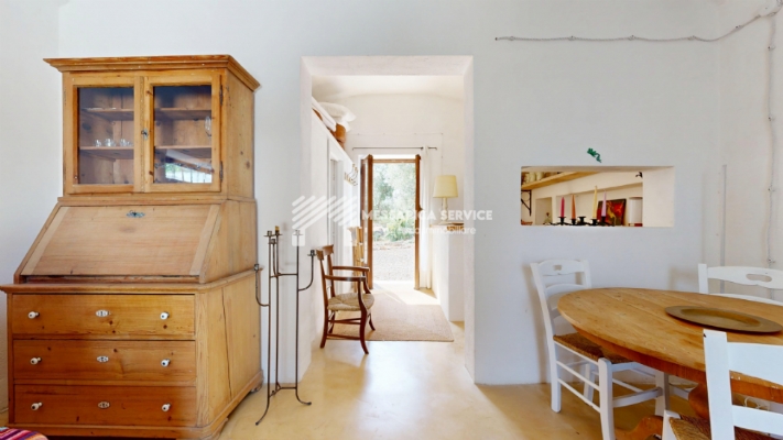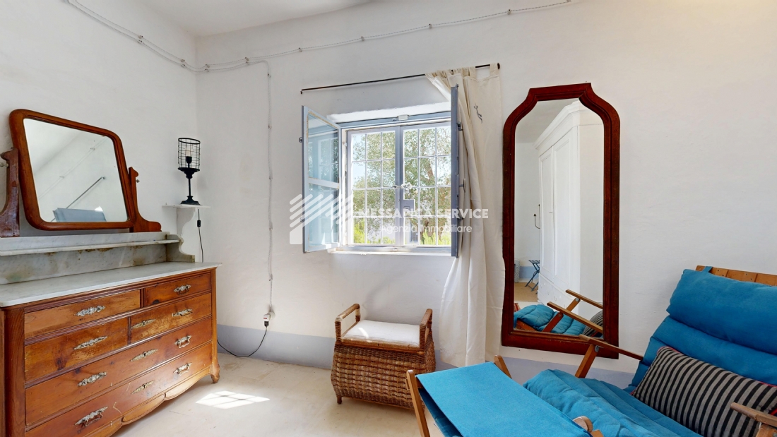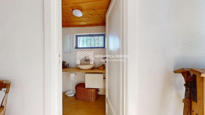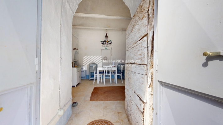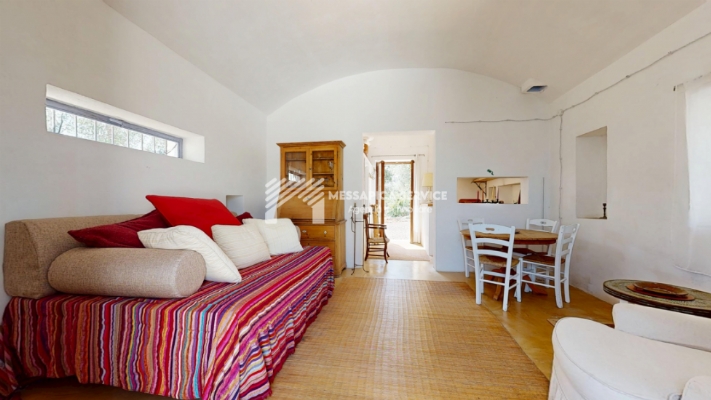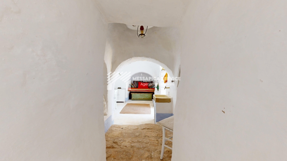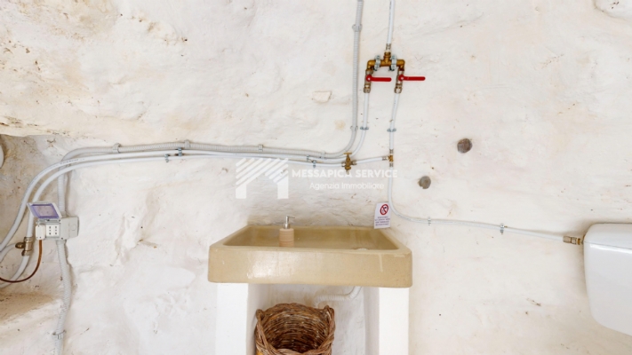 L'abitazione principale include una sala d'ingresso con un'incantevole alcova letto, due camere da letto e un bagno completo realizzato in un cono e con accesso dall’esterno. Di fronte, si trovano altre tre lamie che arricchiscono la proprietà così strutturate:
