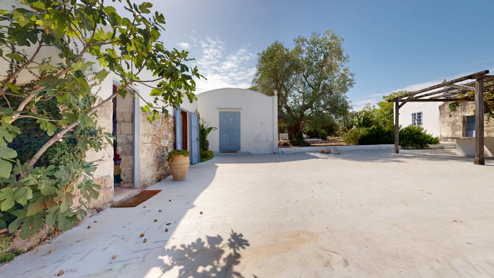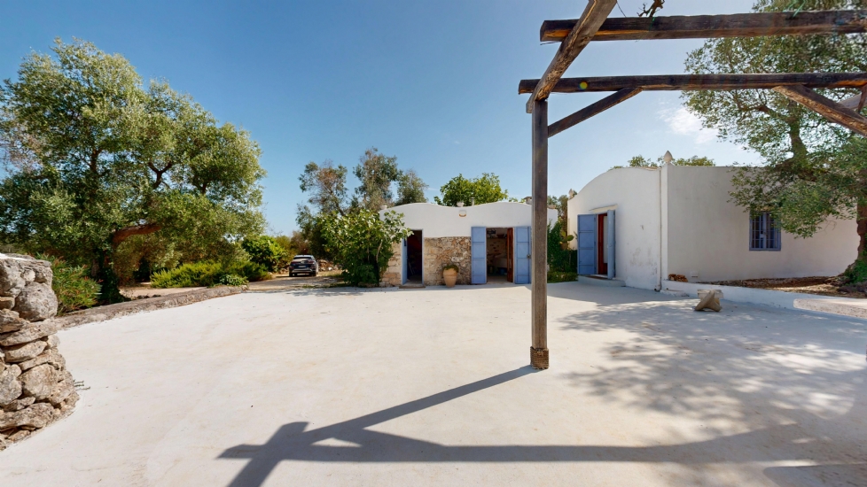 L'abitazione principale include una sala d'ingresso con un'incantevole alcova letto, due camere da letto e un bagno completo realizzato in un cono e con accesso dall’esterno. Di fronte, si trovano altre tre lamie che arricchiscono la proprietà così strutturate: