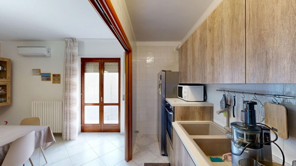 Situato al 1° piano con ascensore, l’appartamento si apre su un accogliente ingresso-soggiorno dove il cucinotto a vista resta elegante e discreto grazie a una ampia porta a scrigno che separa gli ambienti con stile e funzionalità.